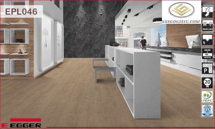 Sàn gỗ Egger Pro Aqua EPL046 có đặc tính cực kỳ bền bỉ nhờ kỹ thuật tạo lớp chống trầy AC4 cao cấp, đặc biệt là chống được tia UV và hạn chế tối đa việc hấp thụ nhiệt từ dưới lên. Cùng mức chi phí tiết kiệm đáng kể so với gạch ngói, có thể vô tư dùng máy làm sạch bàng hơi nước để lau chùi hay vệ sinh.