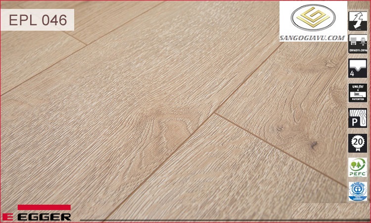 EPL046 có hèm khoá công nghệ bản quyền UNIFIT. Sản phẩm đã được tổ chức PEFC và Der Blaue Engel chứng nhận an toàn cho sức khoẻ và thân thiện với môi trường, đạt chuẩn E1 Châu Âu sàn gỗ công nghiệp. Bề mặt laminate cùng tiêu chuẩn chống trầy xướt AC5+ giúp giảm thiểu trầy xướt ở mức tối đa.
