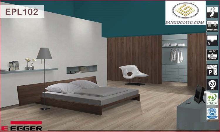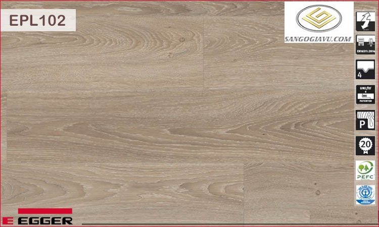 Đến từ bộ sưu tập mang tên Egger Pro quy cách 8mm, sàn gỗ Egger EPL102 là sàn gỗ có độ thân thiện tối đa với môi trường, đạt chuẩn E1 Châu Âu về hàm lượng formaldehyde có trong keo dán (một chất gây ung thư) chỉ ở mức 0,005%. Hèm khoá công nghệ JUST Clic được cải tiến giúp cho các thanh sàn bám chặt với nhau hơn và tiết kiệm thời gian lắp đặt hơn.