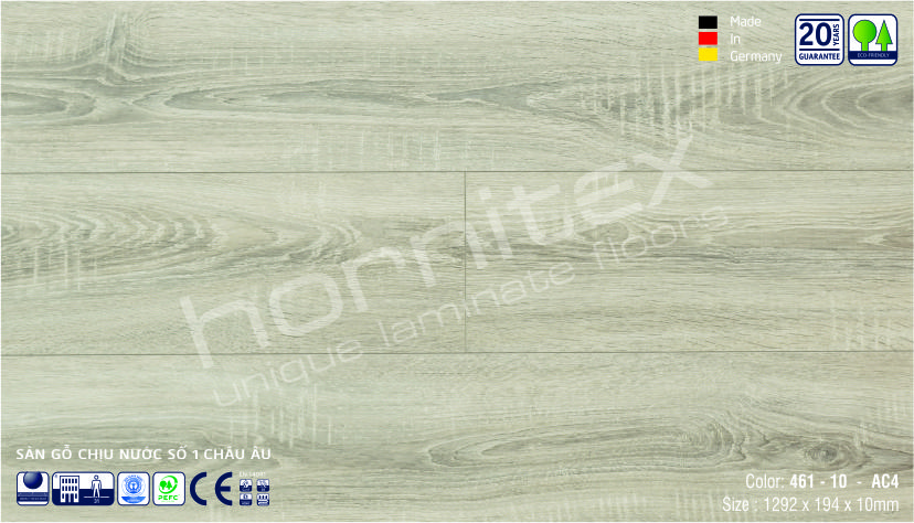 Sàn gỗ Hornitex 461-10 bản dày 10mm thuộc dòng “sàn gỗ công nghiệp cao cấp” không sợ nước,nhập khẩu CHLB Đức, công nghệ sản xuất hiện đại nhất thế giới, thách thức mọi điều kiện khí hậu thời tiết nóng ẩm với khả năng chịu nước đáng kinh ngạc, vân gỗ tự nhiên 3D, bề mặt sần, thớ gỗ đanh chắc.