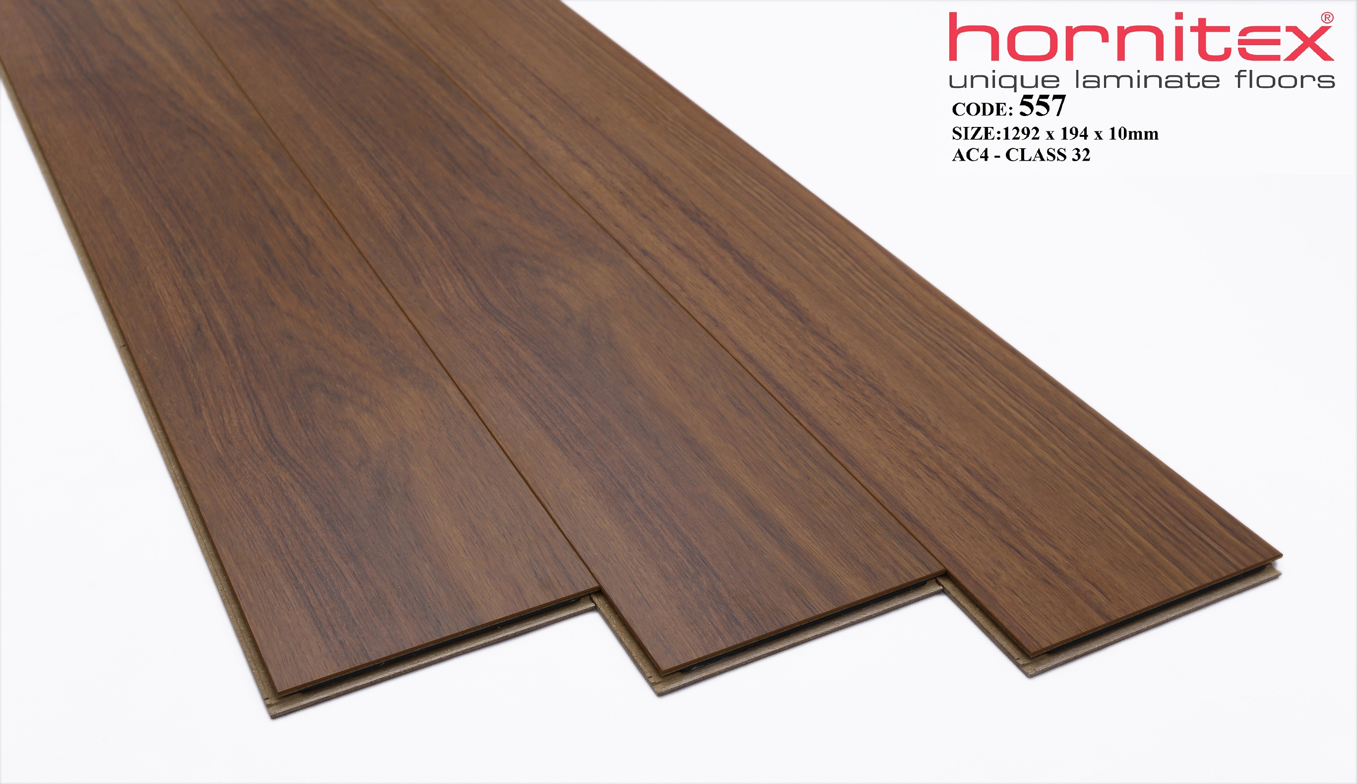 Sàn gỗ Hornitex 557-10 bản dày 10mm thuộc dòng “sàn gỗ công nghiệp cao cấp” không sợ nước,nhập khẩu CHLB Đức, công nghệ sản xuất hiện đại nhất thế giới, thách thức mọi điều kiện khí hậu thời tiết nóng ẩm với khả năng chịu nước đáng kinh ngạc, vân gỗ tự nhiên 3d, bề mặt sần, thớ gỗ đanh chắc
