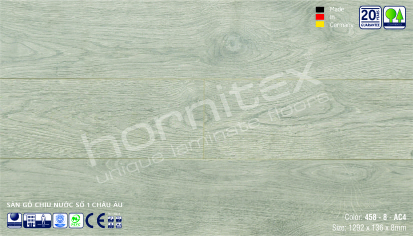 Sàn gỗ Hornitex 458-8 bản dày 8mm thuộc dòng “sàn gỗ công nghiệp cao cấp” không sợ nước,nhập khẩu CHLB Đức, công nghệ sản xuất hiện đại nhất thế giới, thách thức mọi điều kiện khí hậu thời tiết nóng ẩm với khả năng chịu nước đáng kinh ngạc, vân gỗ tự nhiên 3d, bề mặt sần, thớ gỗ đanh chắc => Chinh phục khách hàng khó tính nhất.